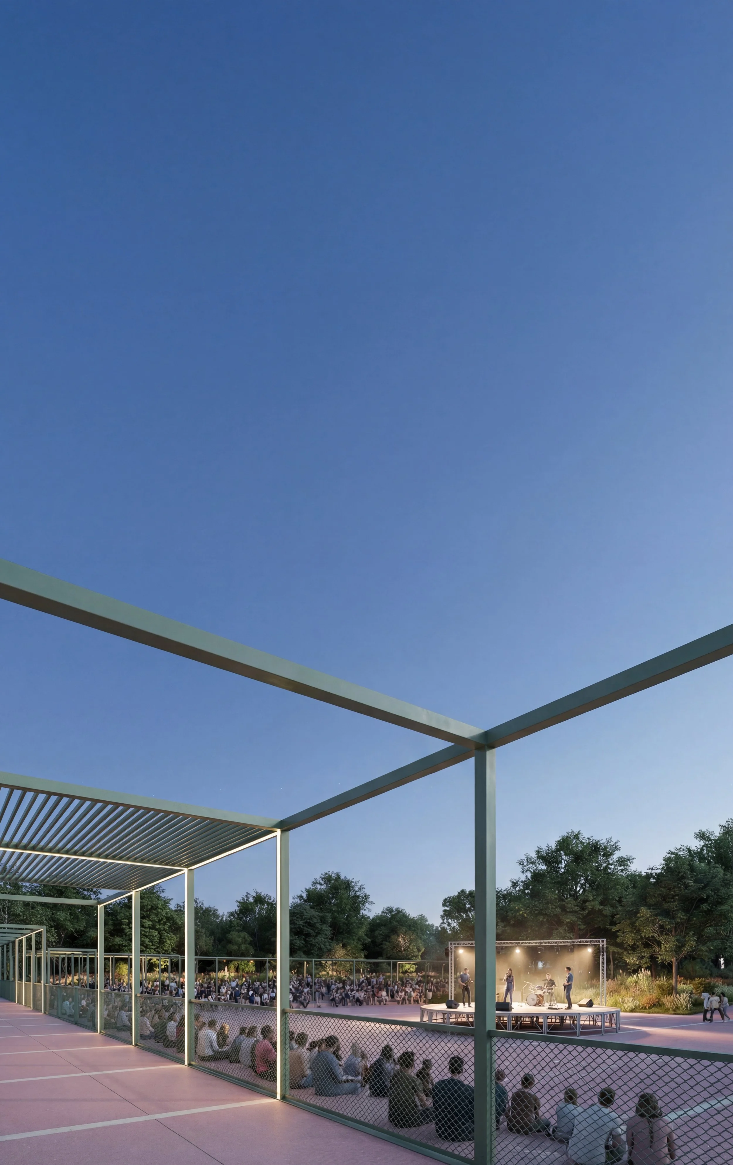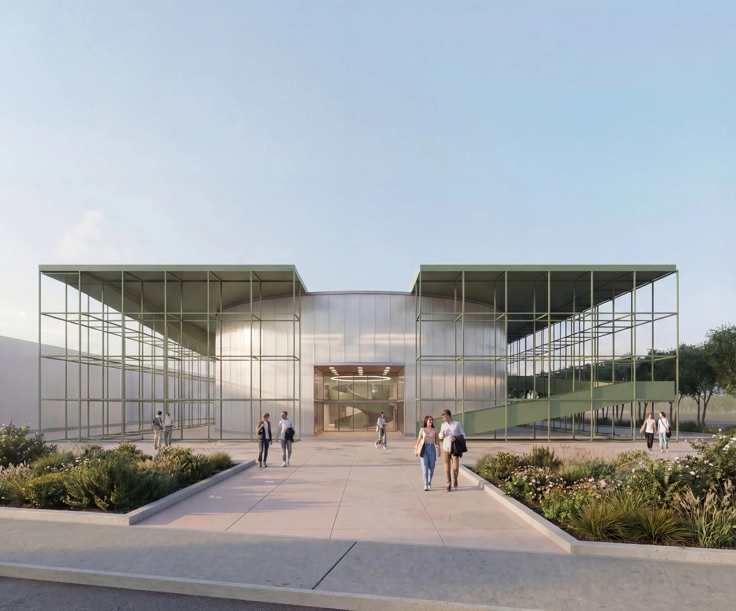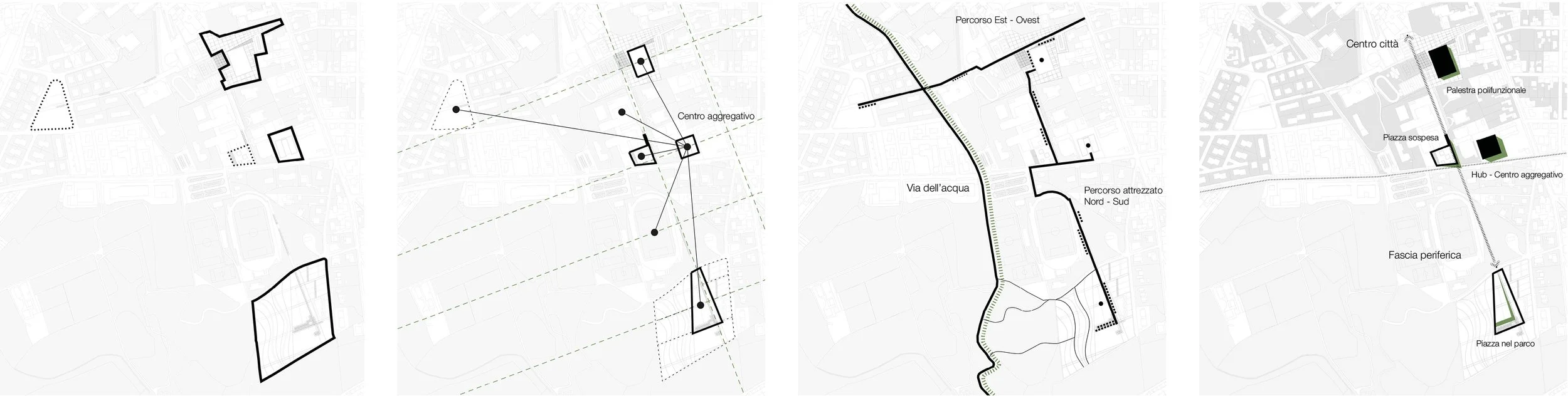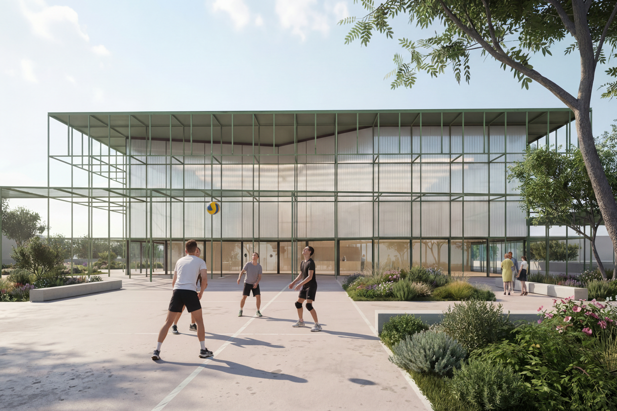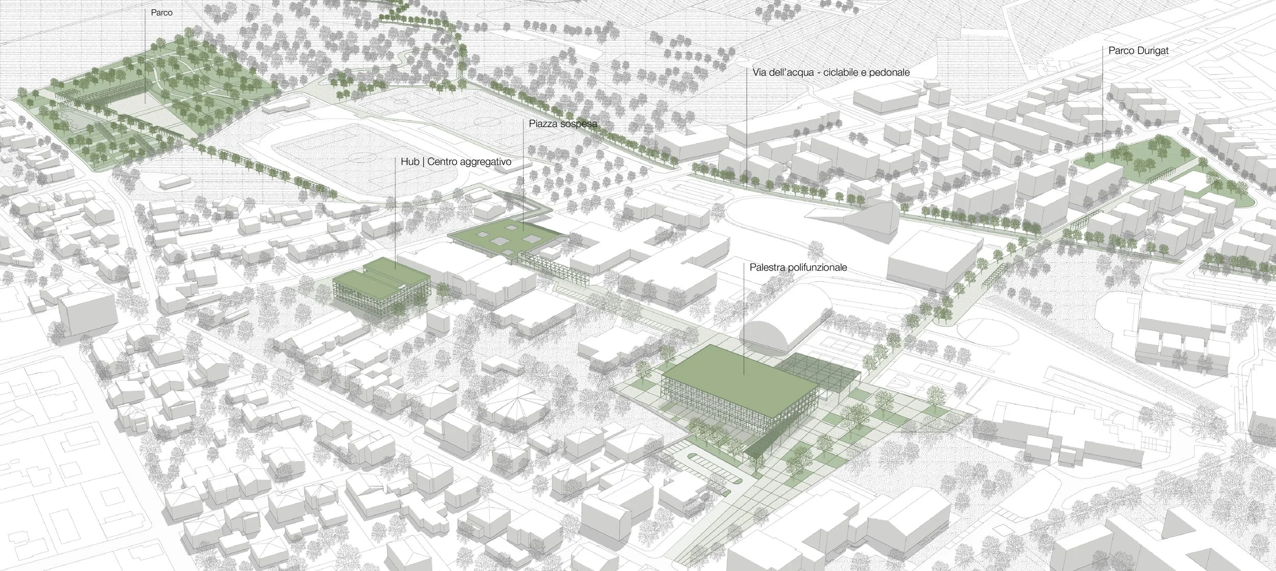 Il progetto affronta un’area particolarmente complessa, che si estende dal tessuto urbano consolidato fino al paesaggio agricolo periurbano. Pur essendo caratterizzata da una vocazione prevalentemente sportiva e didattica, l’area si presenta oggi frammentata e disomogenea per assetto tipologico, orientamento e immagine architettonica degli edifici esistenti. L’intervento mira a riqualificare e ricucire l’intero comparto attraverso nuovi edifici, spazi pubblici e un sistema di connessioni funzionali e visuali definiti da un linguaggio architettonico coerente e riconoscibile. Elemento identitario del progetto è il reticolo strutturale esterno, che diventa segno unificante dell’intervento e viene reinterpretato lungo i percorsi come pensilina, recinzione, elemento di protezione e sostegno delle passerelle.